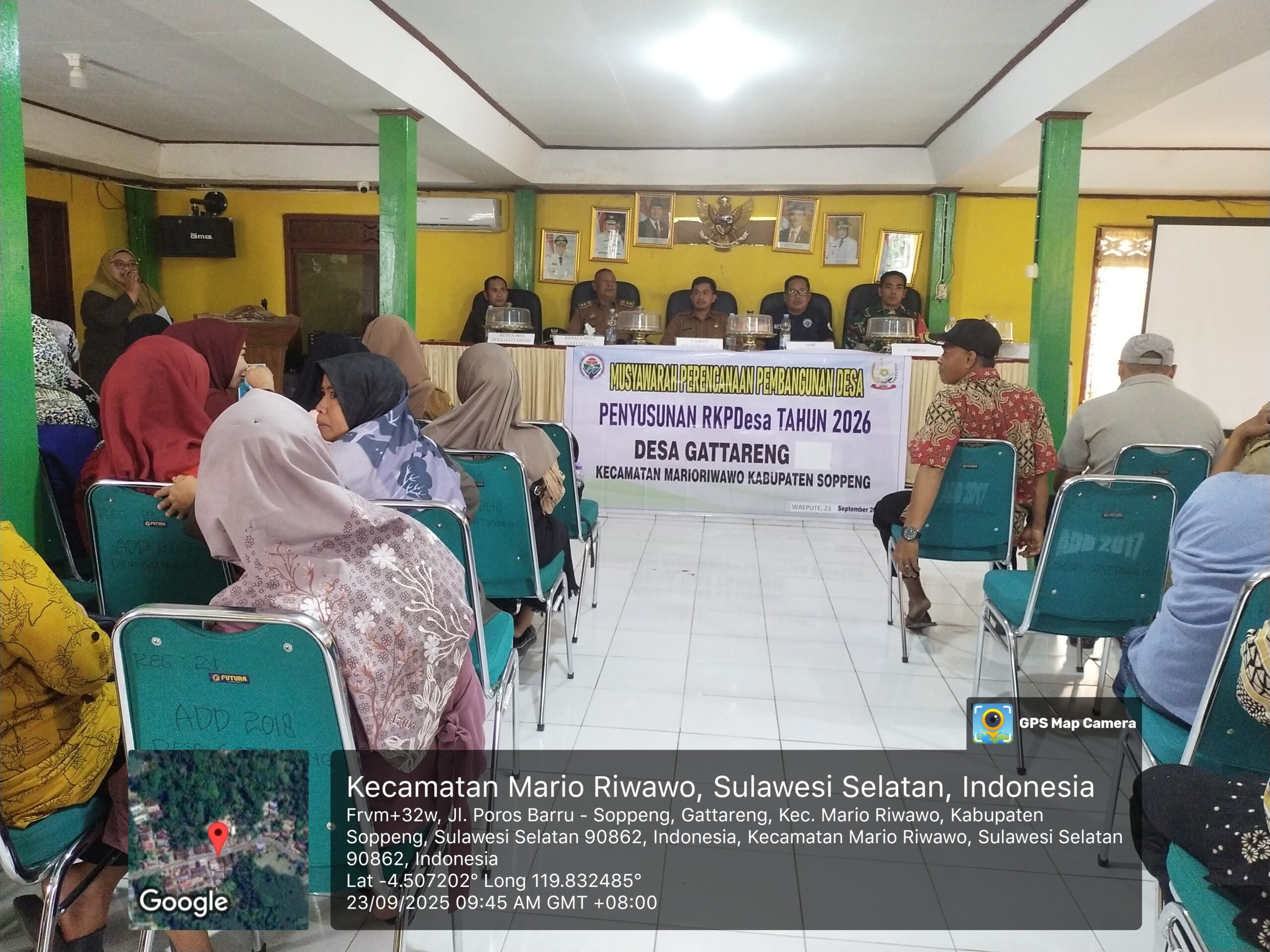 Selasa 23 September 2025 di Aula Kantor Desa Gattareng diadakan Musyawarah Perencanaan Pembangunan Desa Penyusunan RKPDESA Tahun 2026 yang dihadiri oleh Camat Marioriwawo, TAPM Kabupaten Soppeng,BPD Desa Gattareng, Babinsa Desa Gattareng,Ketua LPMD,PLD Desa Gattareng, Kepala Dusun,RT/RW, Ketua Majelis Taklim,Kader Posyandu,Karang Taruna,tokoh pemuda,tokoh agama dan tokoh masyarakat Desa Gattareng. Dalam Musyawarah ini dilaksanakan Pembahasan dan Penetapan RKPDESA Tahun 2026.